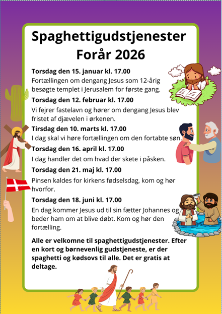Til en spaghettigudstjeneste fortæller vi historier fra bibelen for børnene, så de kan forstå dem. Vi synger med børnene, beder Fadervor og laver en aktivitet i forbindelse med historien.